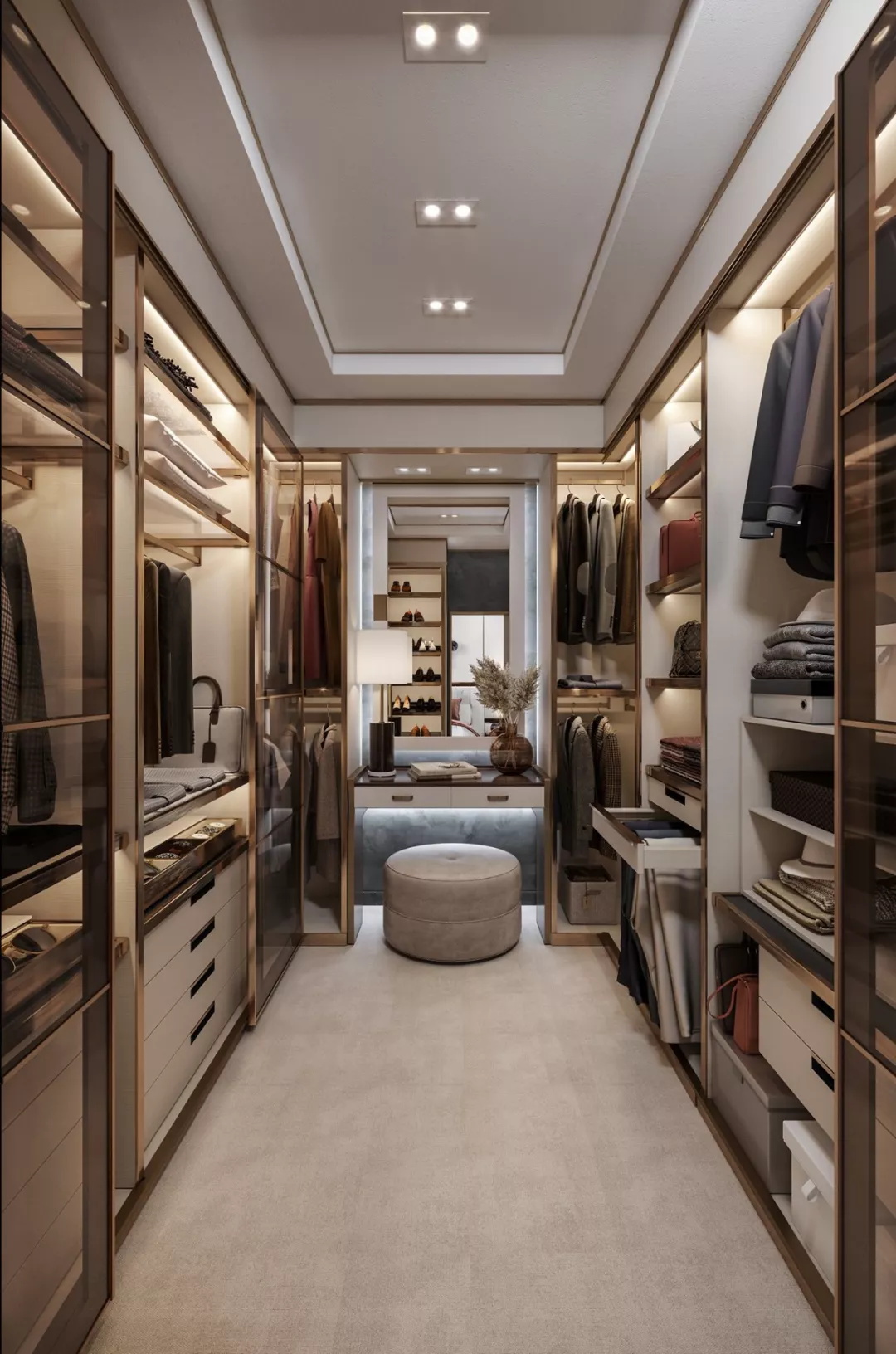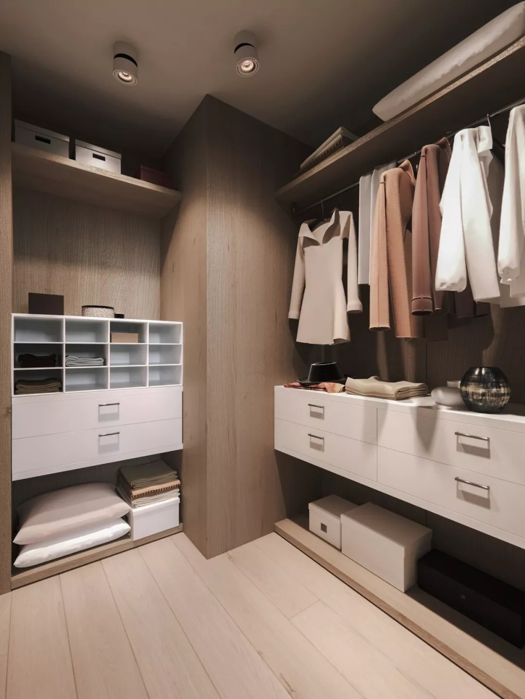 無法設(shè)置獨立的衣帽間,這個時候可以利用轉(zhuǎn)角這個被大家認為空間死角的位置,利用兩處相連的墻面,用衣柜拼接設(shè)計,讓轉(zhuǎn)角區(qū)域成為一個衣帽間,不僅節(jié)省了空間,也很美觀。