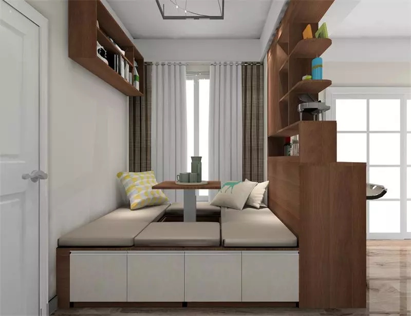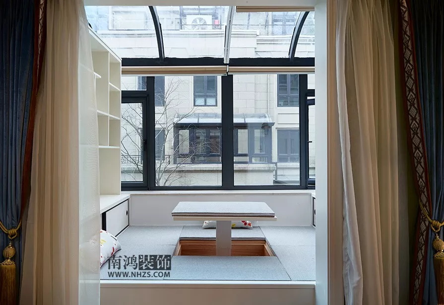 小戶型中以榻榻米+書桌的形式結合,滿足收納功能,也滿足學習工作之余的休憩需求,即便窗外鋼筋鐵林也不影響一茶一飲的自在。