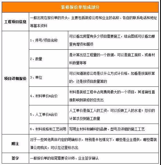 1)看施工項目是否全面,是否漏掉防水、頂面膩子或其他必要項目,避免后期業主迫于無奈增加這項施工的開支,超出預算。