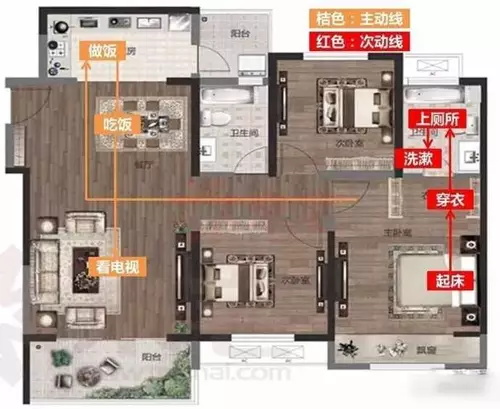 戶型動(dòng)線是指人在戶內(nèi)活動(dòng)的路線,好的動(dòng)線能夠提升戶型利用率,進(jìn)而提高人們的居住品質(zhì)。戶內(nèi)動(dòng)線主要有三種,分別是居住動(dòng)線、家務(wù)動(dòng)線、來客動(dòng)線。良好的動(dòng)線是指從入戶門進(jìn)客廳、臥室、廚房的三條線不會(huì)交叉。