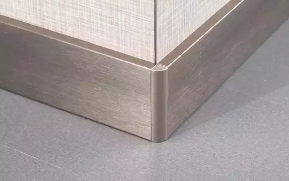 有不銹鋼和鋁合金兩種。早期以金屬光澤居多,多用于辦公室或工業風;現在很多鋁合金踢腳線有了更多的變化,比如木紋、拉絲等,視覺效果也柔和許多,更適合一般家庭使用。因其材質,轉角的處理也會更好。造價相比石材,也較為便宜。