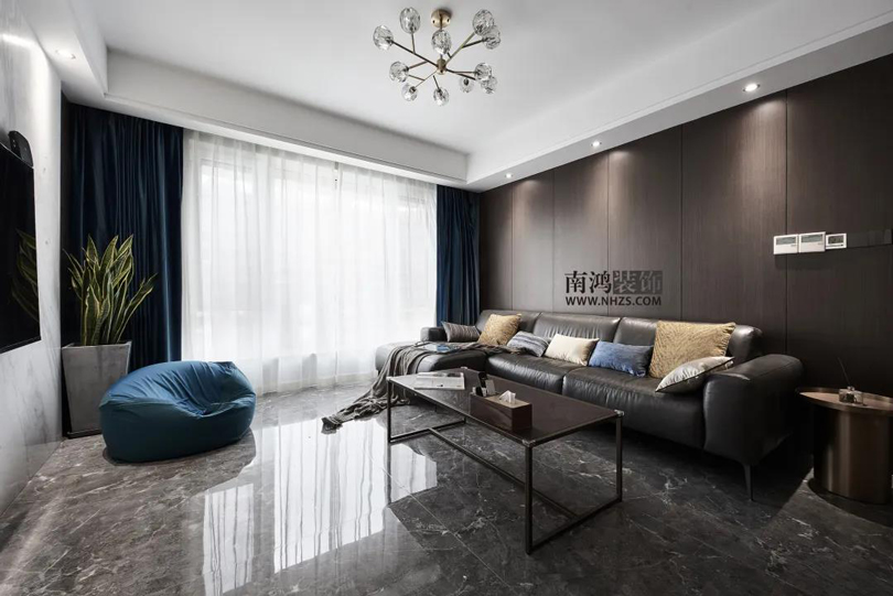 客廳通鋪石紋地磚,黑色皮質沙發(fā)搭配方形現(xiàn)代茶幾,背景墻選用大面積KD板包覆,使得整體風格簡潔明快,大氣爽朗。