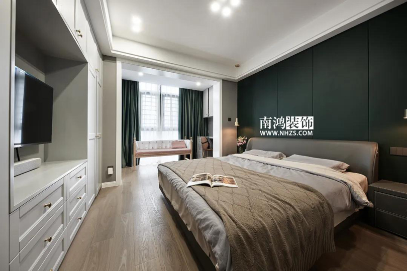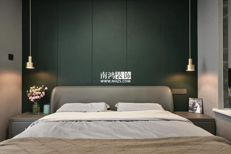 主臥內包進陽臺,增加采光,額外劃出了一塊休閑與工作的地方。室內背景墻采用墨綠色硬包,結合棕色的床品,營造放松而舒適的休息環(huán)境,兩側的金屬材質吊燈點綴出小輕奢格調。