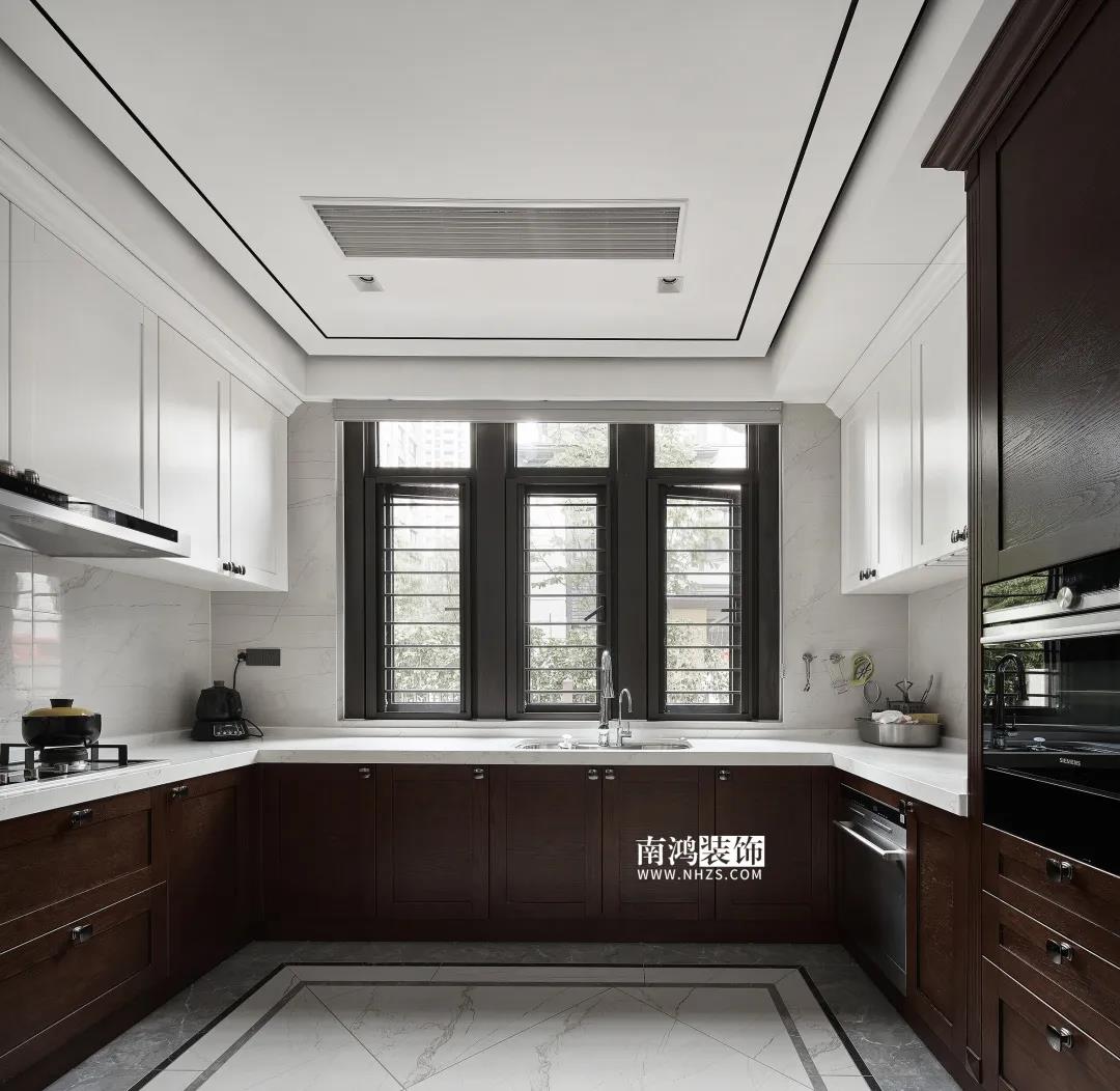 廚房,白色吊柜搭配木質地柜,細致莊重,現代化的內嵌廚電打造出設備齊全的料理空間,靠門一側還設計了吧臺。