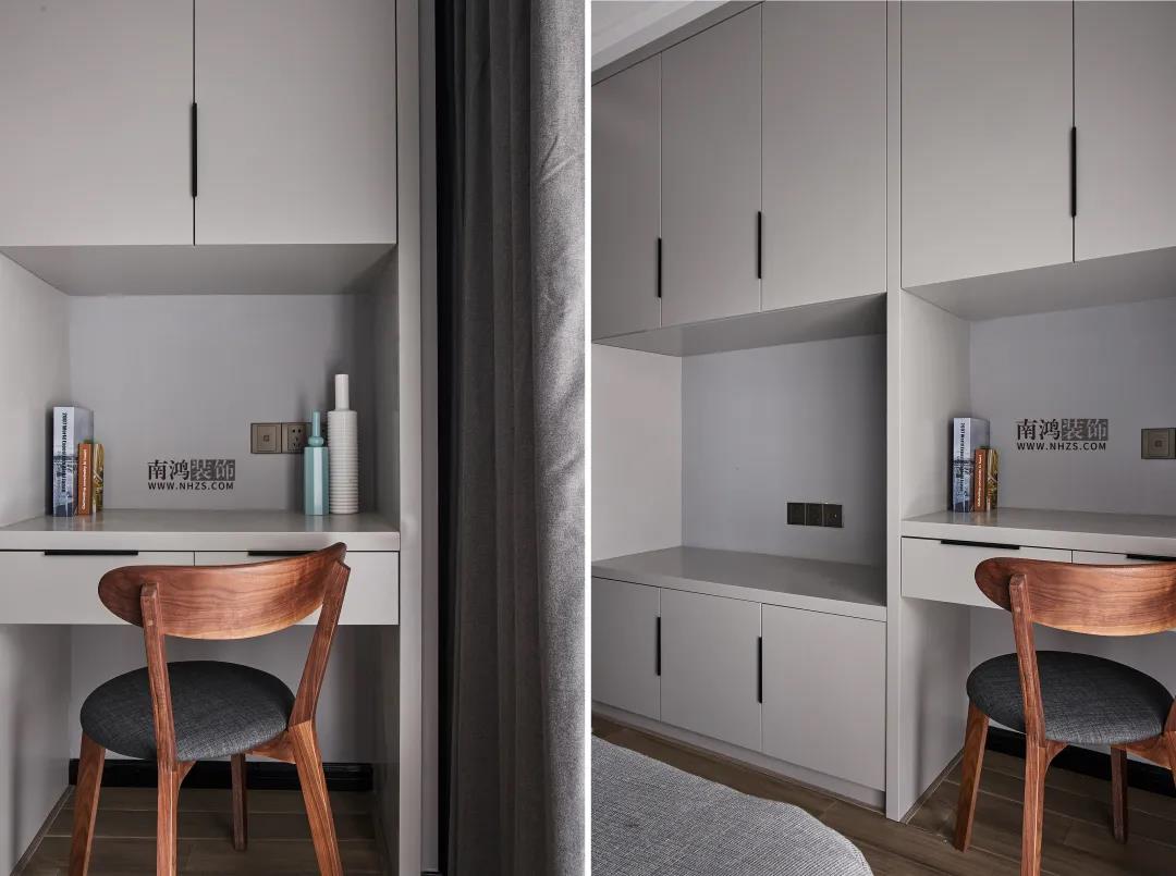 次臥以不同階度的灰色打造,色調(diào)統(tǒng)一的同時又巧妙劃出了層次,一角黑白塊樣式的小幾替代了床頭柜,是個小亮點。