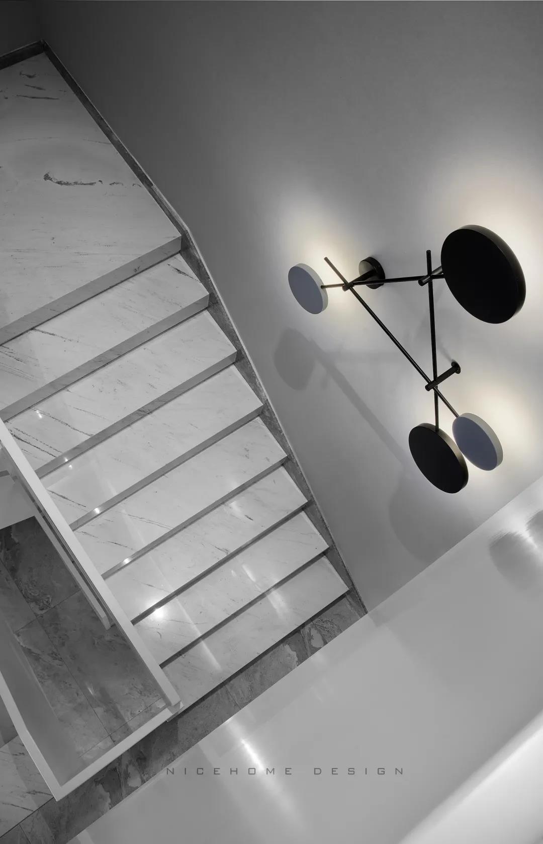 一層原結(jié)構(gòu)樓梯位置不合理,處于入戶正對口,現(xiàn)移動(dòng)至西側(cè)以規(guī)避缺陷。客廳主沙發(fā)后做一面凌空隔斷墻,增加視覺層次與進(jìn)門后的儀式感。