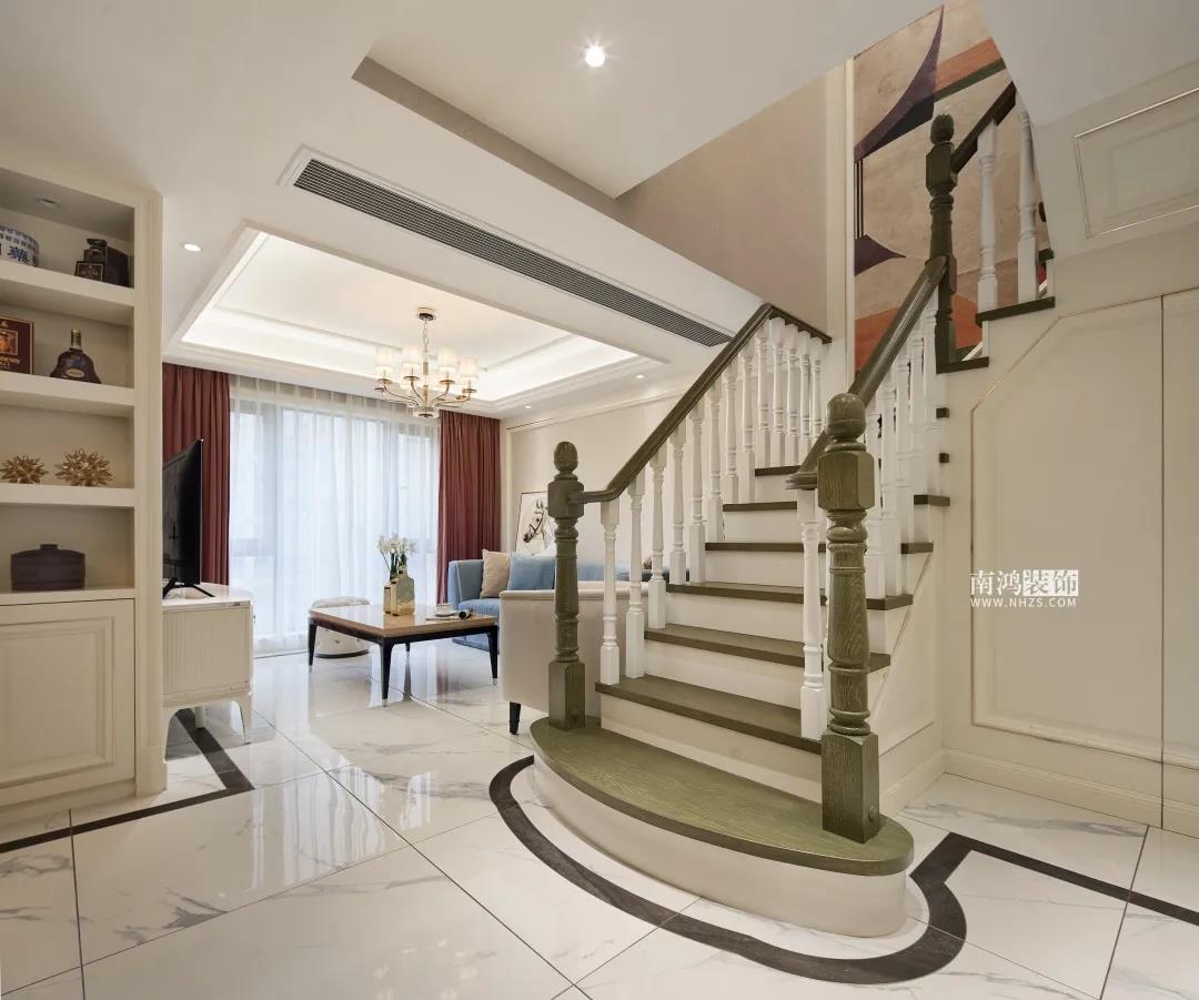 【項目·信息】 地址 / 名門世家 戶型 / Loft戶型 面積 / 139㎡ 風格 / 現代輕奢美式 設計施工 / 浙江南鴻裝飾 本案為業主朱女士的退休住房,平常是夫妻倆居住,女兒一家四口會偶爾過來。朱女士本人性格十分熱情開朗,喜愛旅游、運動,在房屋設計上要求明快而時尚的色彩搭配,以及足夠多的儲物空間。 本案在硬裝上是以實木復合木作和工藝皮革硬包為主要材質,家具軟裝則是在象牙白的基調上,添加入業主喜愛的亮麗色彩和具備現代感的輕奢元素,擯棄了厚重的外形表現,更加注重保留美式特有的溫情體驗。 · 一樓書房采用開放式設計,很好導引了采光。 · 調整了樓梯洞口的長寬與踏步尺寸,定制同色復古風扶手、踏步,讓樓梯區域看起來更有質感。 · 樓梯下方使用木飾面暗門,背后做儲藏室設計,增加儲物空間。 象牙白色,既溫暖又包容,低調而又內斂,作為室內的主基調是再合適不過了。 客廳以現代生活方式的簡約表現融合優雅的美式古典元素,成就別具一格的輕奢空間。 餐廳與客廳之間沒有隔閡,能實現更高的互動性。木質拼花圓桌與圓潤吊頂呼應,演繹出動人的空間韻律。 餐廳一側壁面以大幅鏡面元素裝飾,通過其反射光線的效果擴寬了空間的視覺維度,并極大增強采光。 書房做開放式設計,讓光線可以不受約束地傳遞到外部餐廳的位置,同時留出一部分柜體位置以嵌入冰箱,節省廚房空間。 樓梯洞口的長寬與踏步尺寸均得到精細調整,特意做舊的復古綠木扶手、踏步會更具質感和設計感。墻面定制抽象掛畫,跳躍的色塊激情傳遞著活力因子。 女業主的臥房,為貼合她熱情開朗的個性而選擇了愛馬仕橙的硬包背景來點亮整個室內空間,簡潔又不失格調。 為女兒準備的臥房,更能體現當代都市女性的審美需求。整體以沉穩的中性色為基調,搭配深藍色天鵝絨休閑椅和暗紫色絨布窗簾,富有層次感的色彩輕松打造出頗具藝術感的睡眠環境。