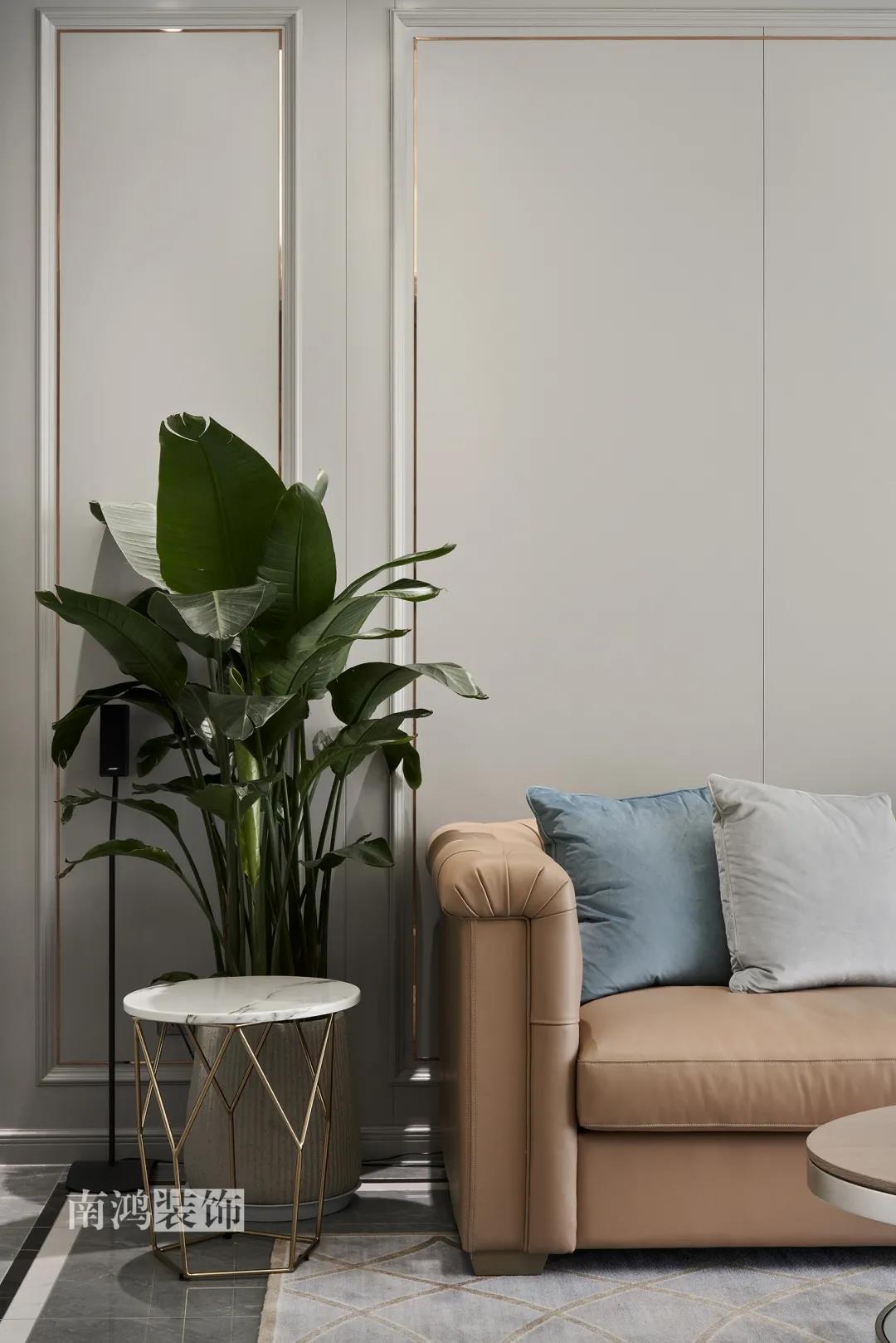 沙發(fā)背景墻是全屋統(tǒng)一的木做護(hù)墻添加入金色不銹鋼線條,淺棕色的主沙發(fā)平衡空間情緒,溫和視線。