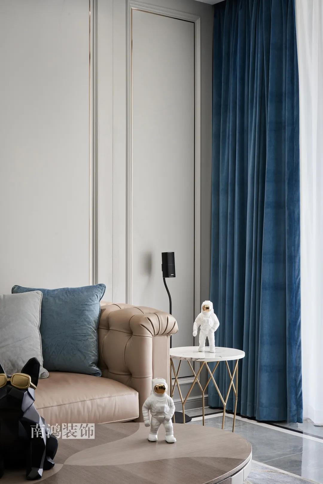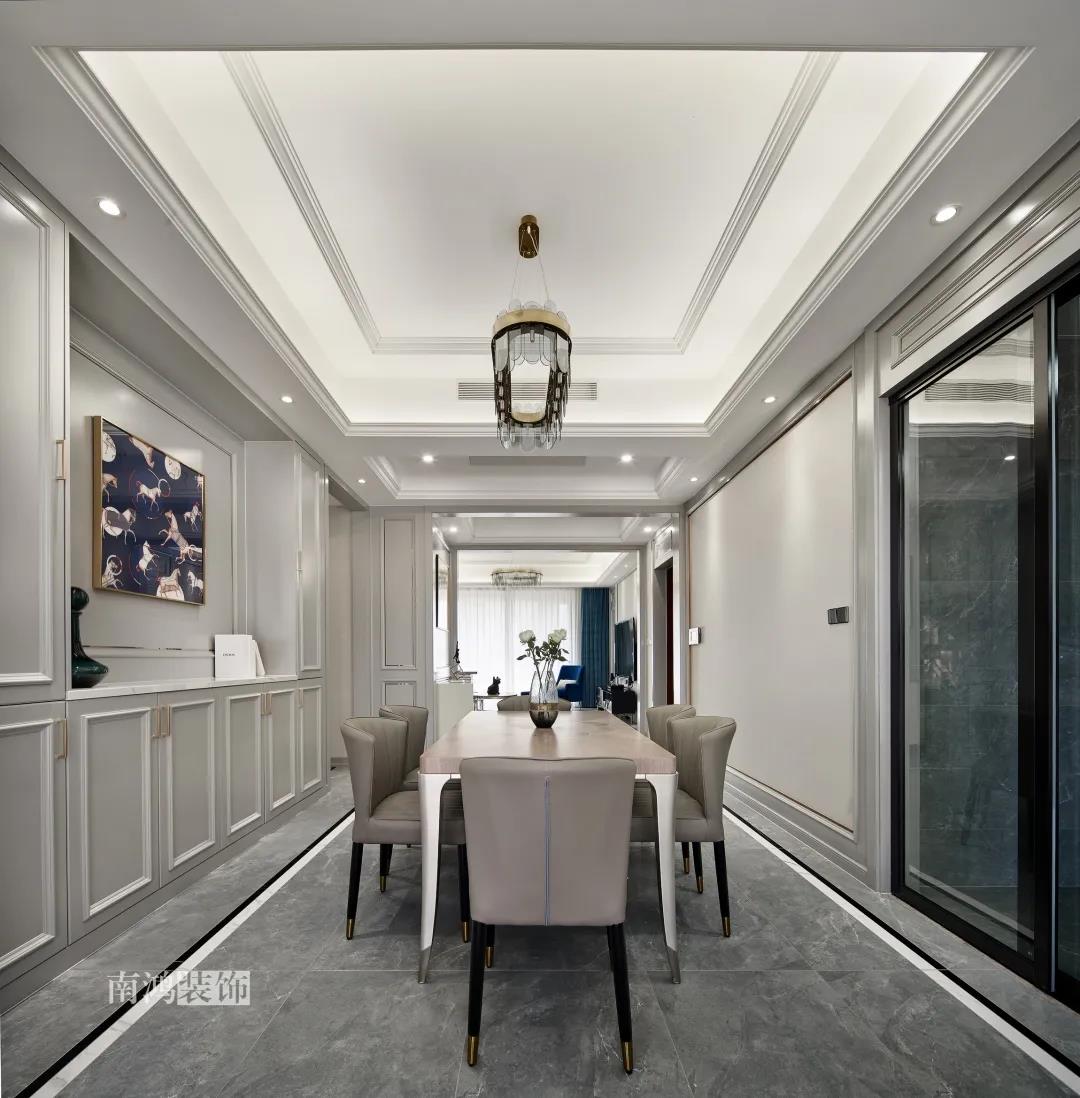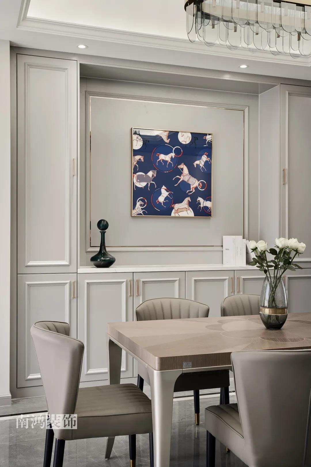 本案在硬裝上采用全屋護(hù)墻板,組合上不銹鋼線條,呈現(xiàn)非常有質(zhì)感有層次的輕奢細(xì)節(jié)。張弛有度的設(shè)計(jì)處理,強(qiáng)化了對空間框架和秩序的知覺,為屋主營造出頗具儀式感的生活氛圍。