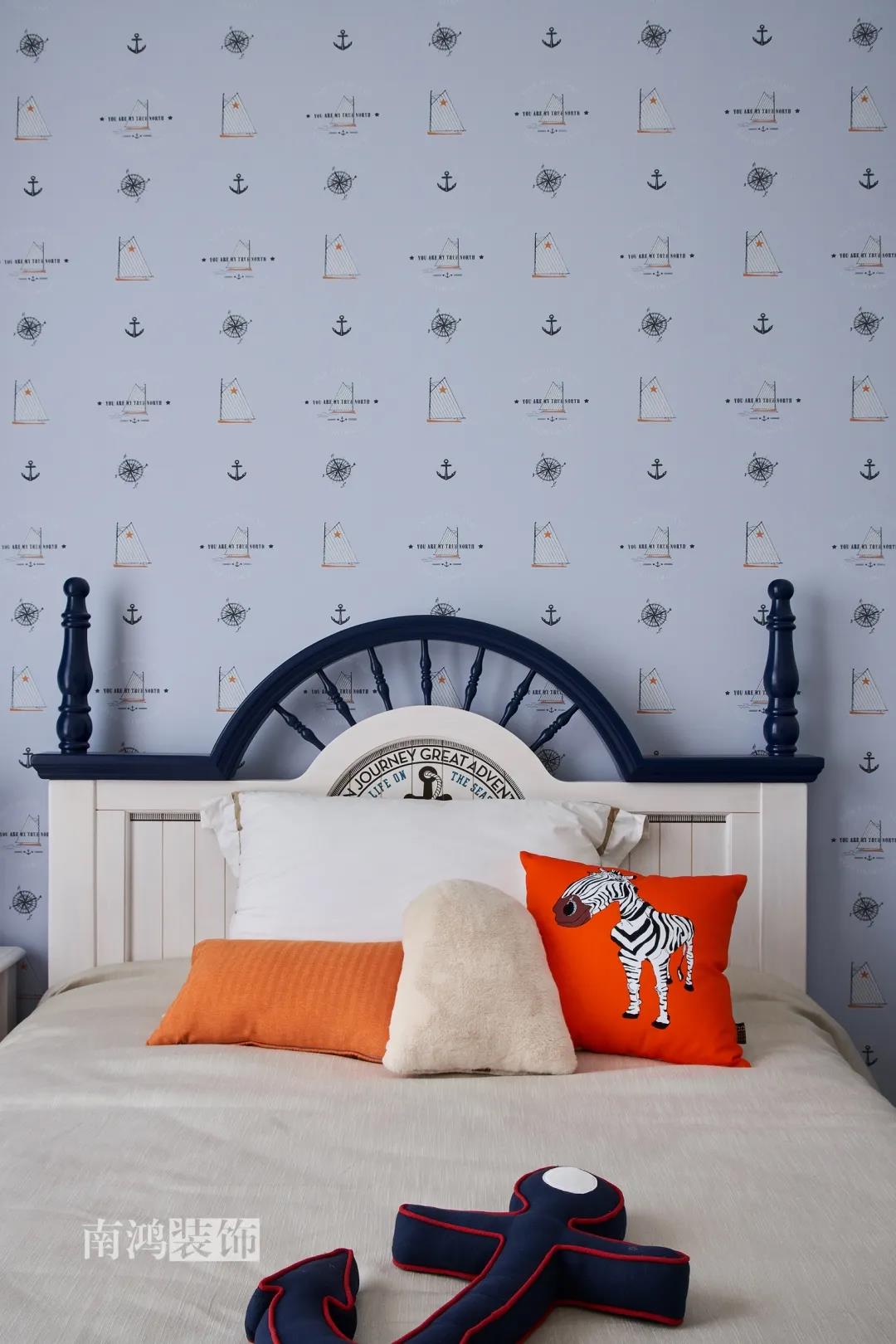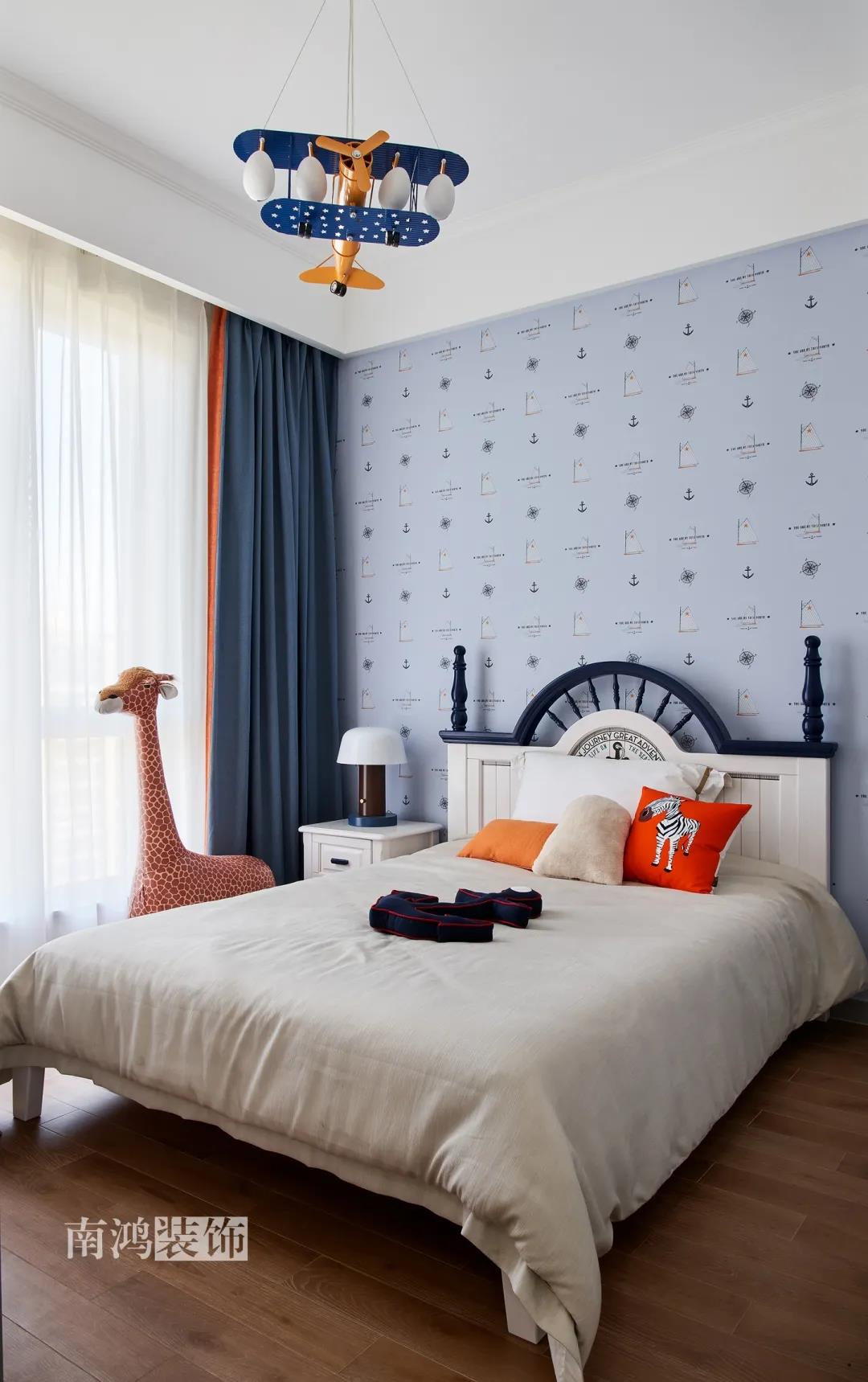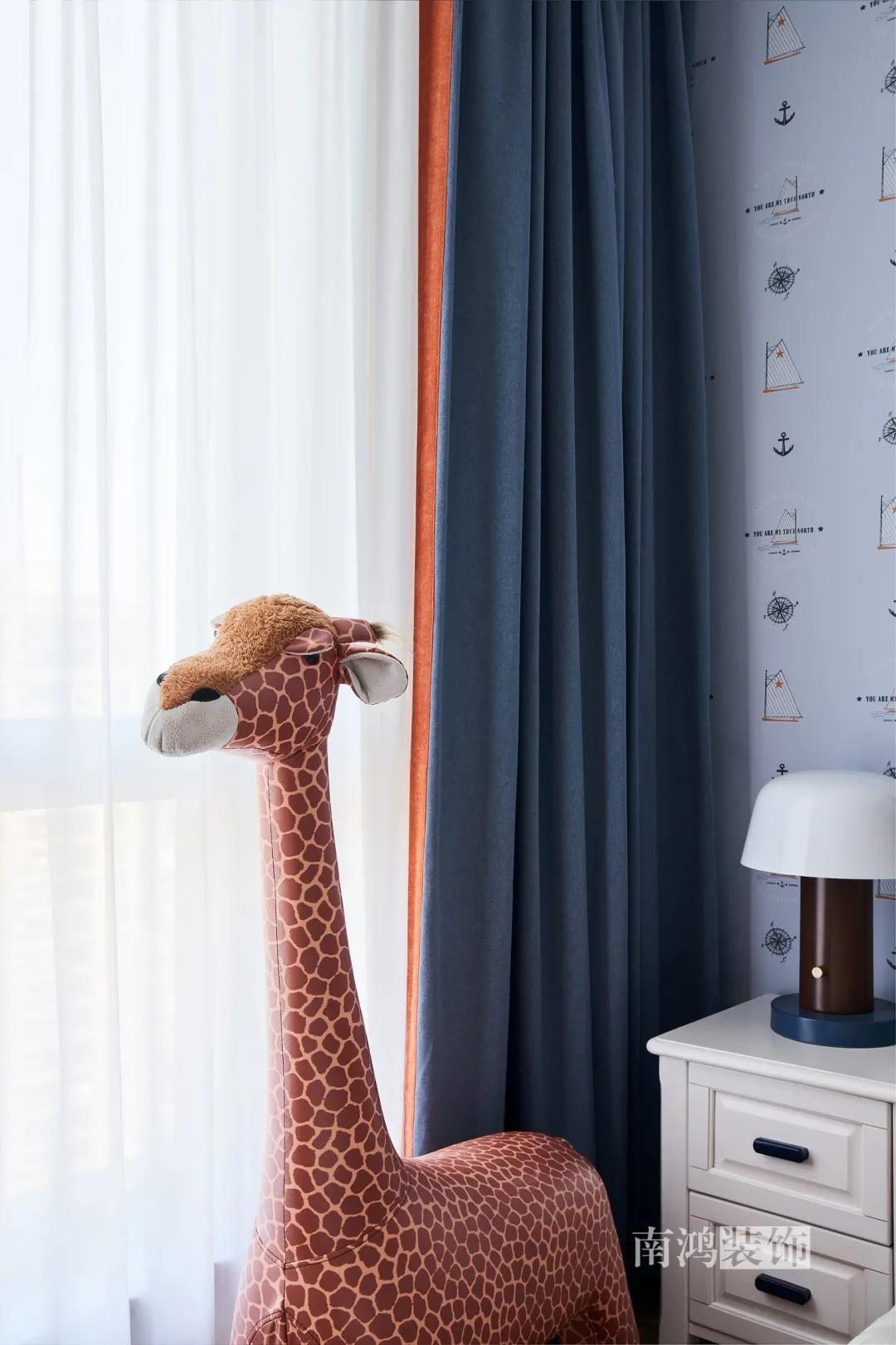 兒童房主打男孩喜愛的藍(lán)色系,飛機(jī)樣式的吊燈與長頸鹿玩偶充滿著浪漫的想象,將活潑的童趣與審美融合得恰到好處。