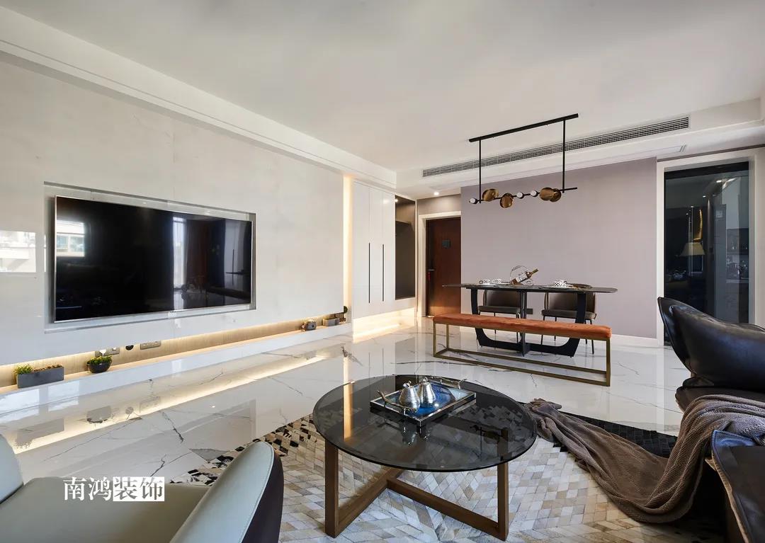 ▲客廳呈開放式布局,家具間不同材質(zhì)的碰撞,打造輕盈時(shí)尚的生活環(huán)境。電視背景墻以地臺(tái)取代傳統(tǒng)電視柜,視覺效果統(tǒng)一大氣。