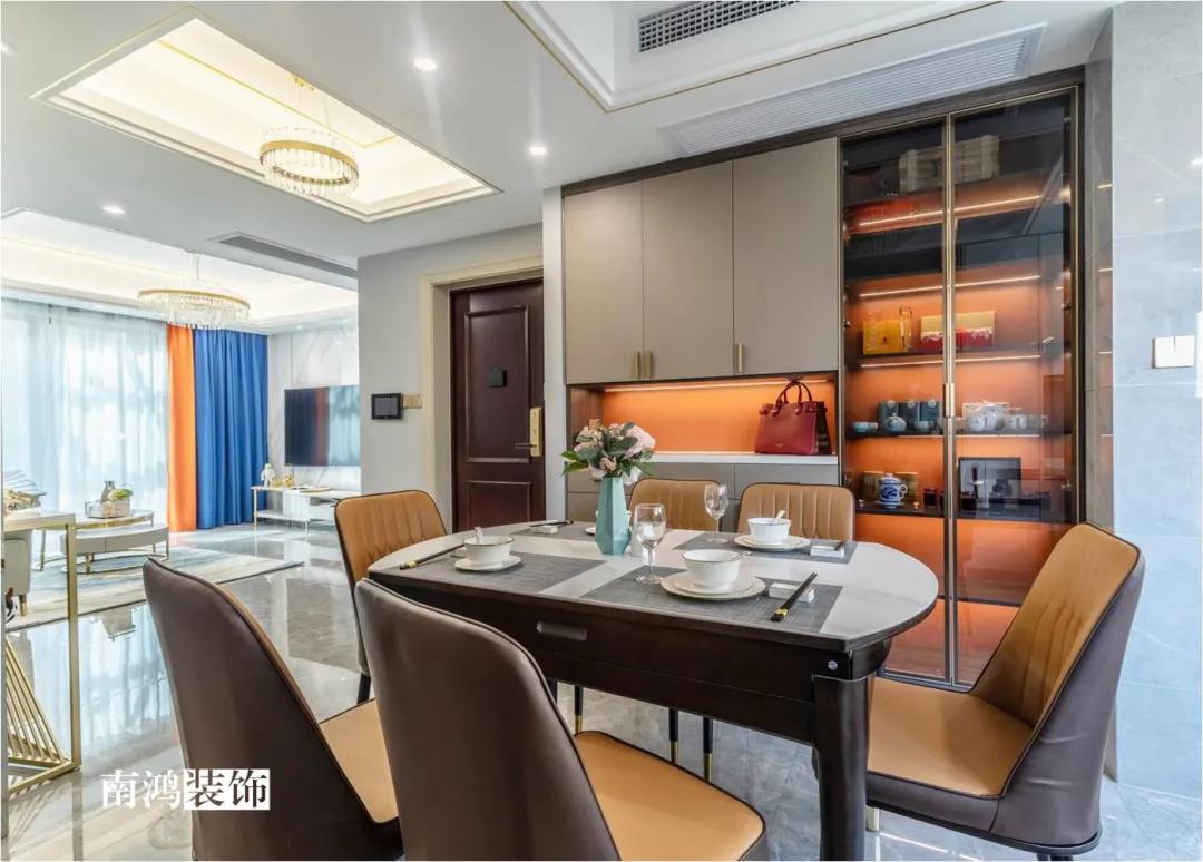 ▲餐廳與陽臺(tái)相鄰,絨面的磚紅色長(zhǎng)凳和些許金色元素點(diǎn)綴出輕奢格調(diào)。