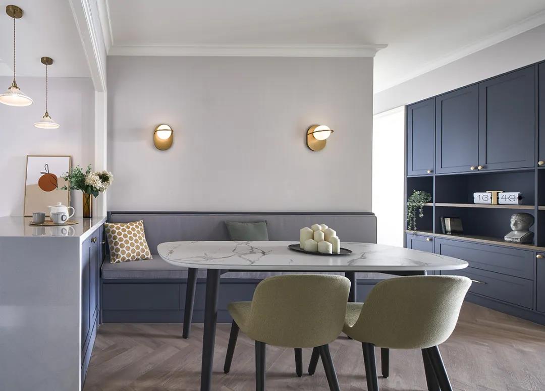 卡座設計具有節省空間和提供收納的雙重功用。卡座一般都是貼墻,只需留出一邊過道就行,而且卡座可以結合收納柜,使得餐廳的收納能力大大提高。